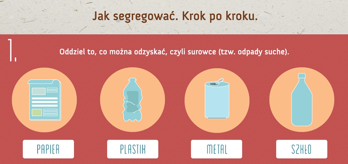 Do pojemnika/worka niebieskiego trafi papier, do zielonego – szkło (z możliwością rozdzielenia na szkło bezbarwne – biały i szkło kolorowe – zielony pojemnik/worek), żółtego – metale i tworzywa sztuczne, a do brązowego – odpady ulegające biodegradacji.